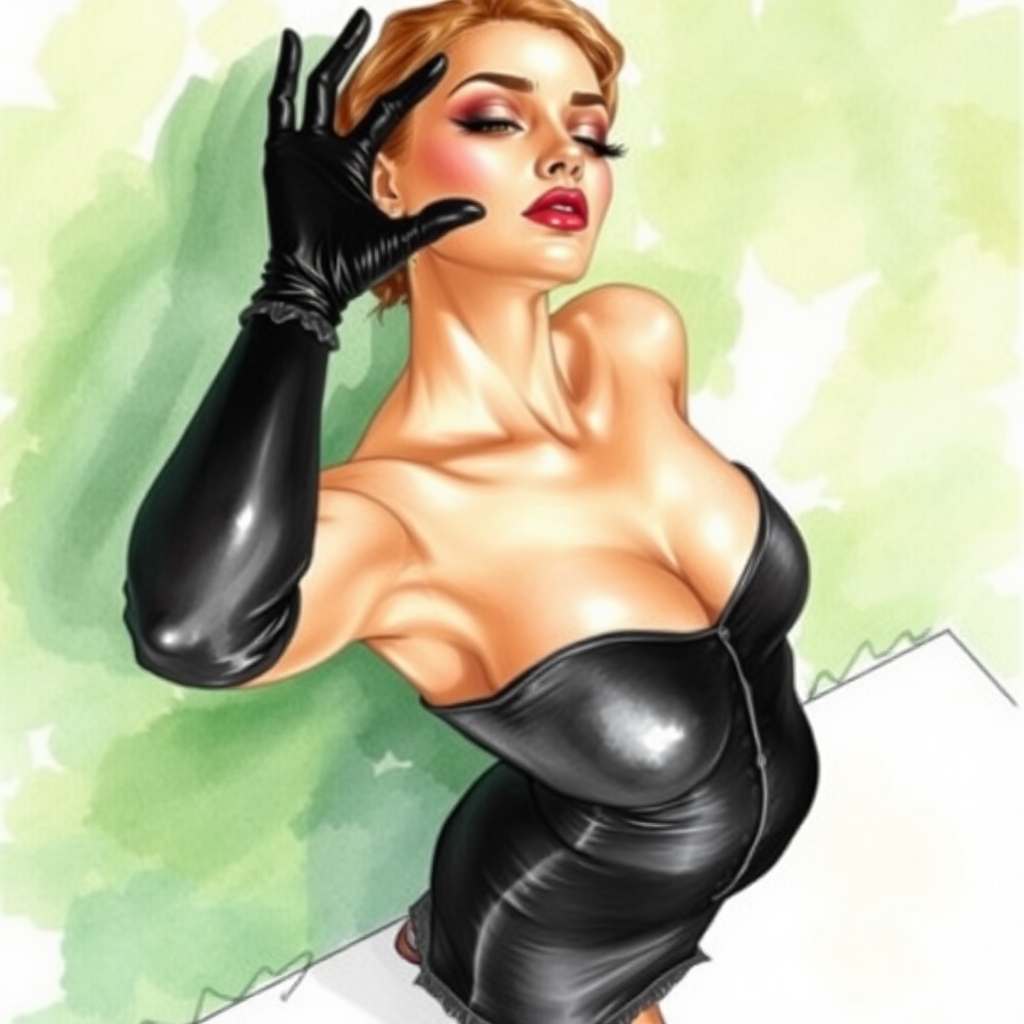 The image features a woman dressed in a revealing black dress and gloves, striking a pose for the camera. The background is green, possibly a wall, and the woman is standing on a white floor. She has large breasts, her eyes are closed, glossy make-up