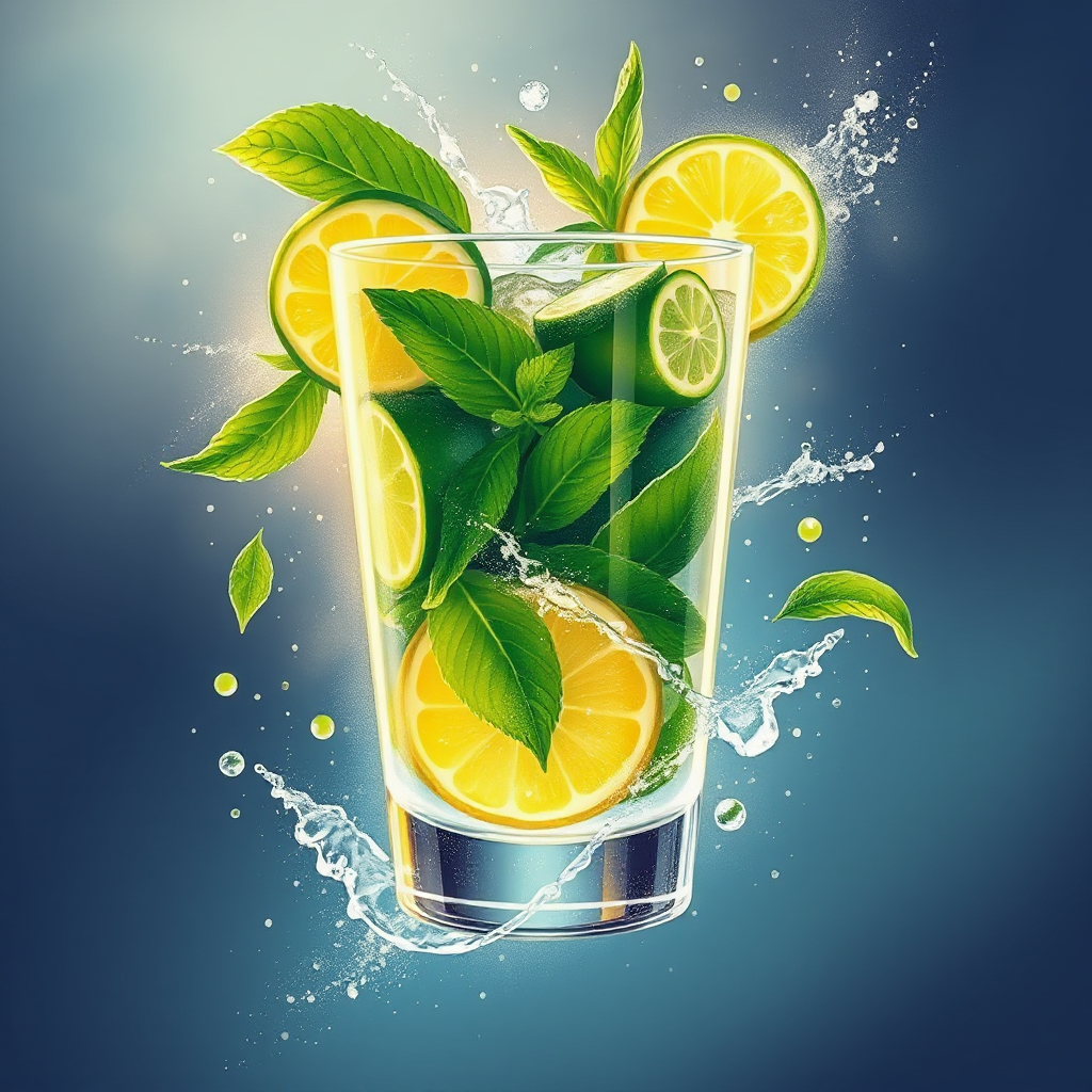 A dynamic digital painting of a mojito assembling in mid-air, shown in reverse — mint leaves swirling gracefully, lime slices glowing with emerald and yellow hues, sugar and soda bursting into radiant particles. The glass is semi-transparent, glowing softly as the ingredients converge toward it. Stylized brushwork with smooth gradients and luminous highlights, inspired by watercolor and vaporwave tones. Dreamlike composition, balanced energy, 4K art print quality.
