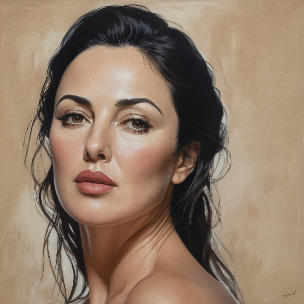 This is a realistic portrait in the hyperrealism genre. The main subject is a woman with long, wavy hair and striking features, captured from the waist up against a simple beige background that accentuates her form. She is posed slightly to the left of center, looking directly at the viewer with a gentle expression. Her skin tones are smooth and she has a light complexion. The woman's eyes have a slight shadow under them, adding depth and realism. There is a soft play of light on her face, highlighting the contours of her features and creating a sense of calm and serenity. The use of earthy tones gives the image a warm and inviting mood.