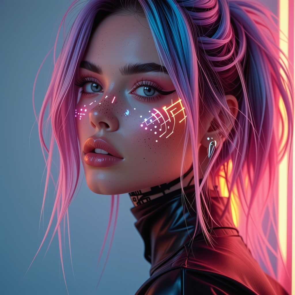 The image is a striking portrait of an individual with dyed hair that resembles a blend of blue and pink hues. Their eyes are accentuated by vibrant purple and orange accents, giving them a futuristic or alien appearance. The person's makeup includes dramatic lines around the eyes and lips, enhancing their unique look. They are adorned with an intricate pattern on their face, suggesting a cyberpunk or avant-garde aesthetic.
