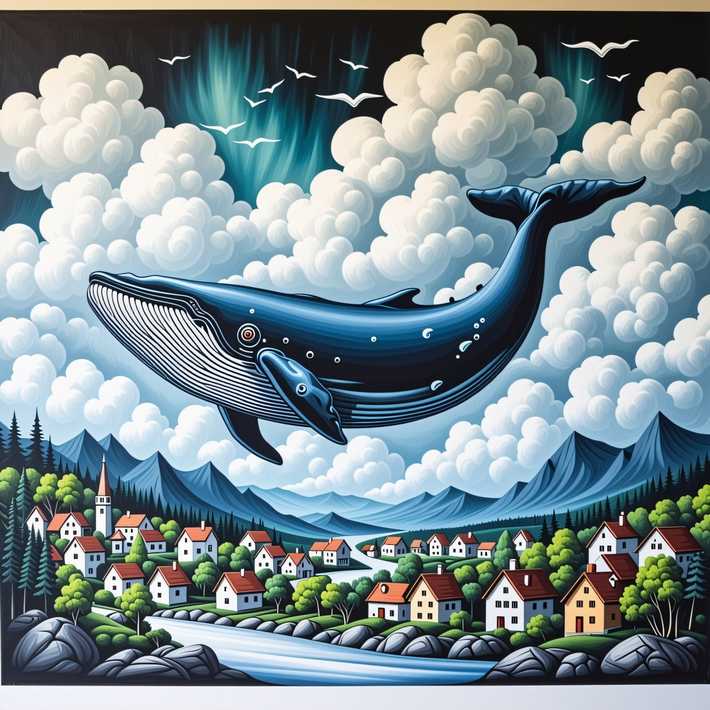 The image depicts a whimsical scene with a large blue whale in flight above a small town nestled by a body of water. The whale is adorned with a white spot on its forehead and has a red circle inside it. Below the whale, there are several houses and buildings painted in shades of blue, green, and brown. The sky above the scene is filled with clouds and features a few birds flying in the distance.